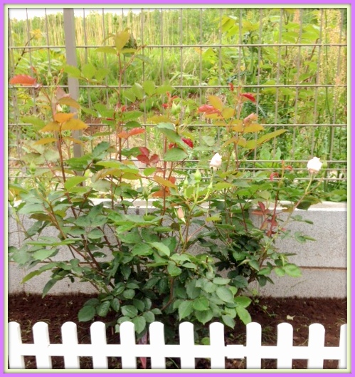 よく見てみると、左右に植えたバラももう少しで咲きそうな蕾を