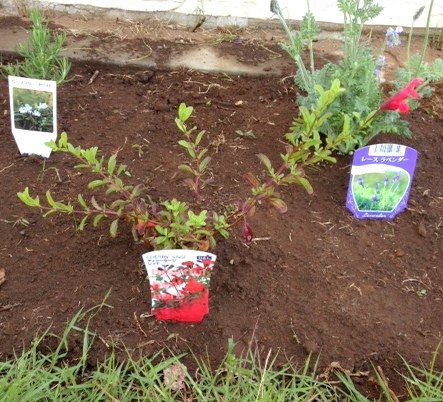 ラベンダー、手前にセージとタイムを植えました。
